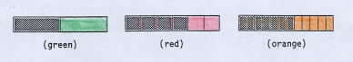 Gradually, this became unnecessary as the students became familiar with the bars. Mike and Alex revised Fraction Bars Black Jack (see illustration) by requiring that three arbitrary fraction bars be placed face up at the beginning of each round. The total shaded amount of these bars became the "target" for the round. They called their game Super Black Jack. In one round the following three bars were selected. |