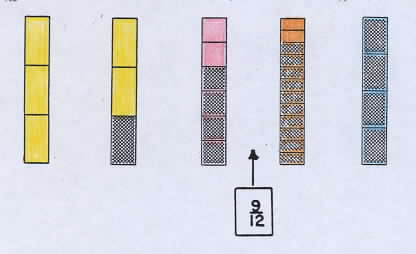 | Mike explained that the red bar can be combined with the green bar to form one whole bar with one part out of six left over. This can be put with the orange bar to give nine parts out of twelve. So for this round each player tried to get as close as possible to one whole bar and nine parts out of twelve. Alex won the round with the following four bars. He matched his red bar with the one on the board and put the leftover part of the red bar with his yellow bar to equal the shaded amount of the green bar. Then since one part out of four equals three parts out of twelve, he held with one whole bar and five parts out of twelve. | |||||||||||||||||||||||||||