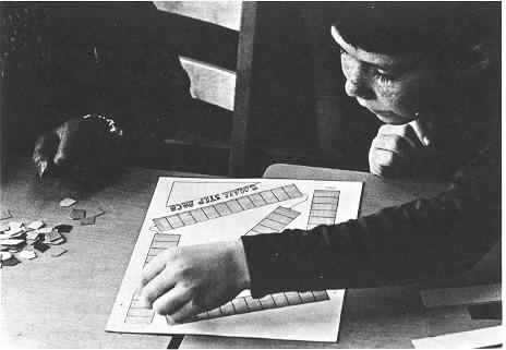 The student below is moving his marker on the third of the five bars on the Small Step mat.